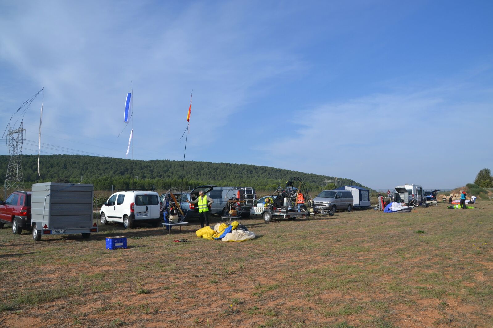 No fue así, desgraciadamente. Aunque la noche fue tranquila, el día amaneció totalmente cubierto y con previsión de lluvias, no sólo en esa zona, sino en diversos puntos de la Comunidad. Debido a las malas previsiones, se tuvo que aceptar que lo más aconsejable era cancelar las restantes pruebas previstas para el domingo, de tal modo que los participantes pudieran volver con seguridad a sus campos de origen. Tampoco los paramotores llegaron a despegar, aunque ya habían comenzado a preparar la infraestructura y ondeaba su manga de viento.